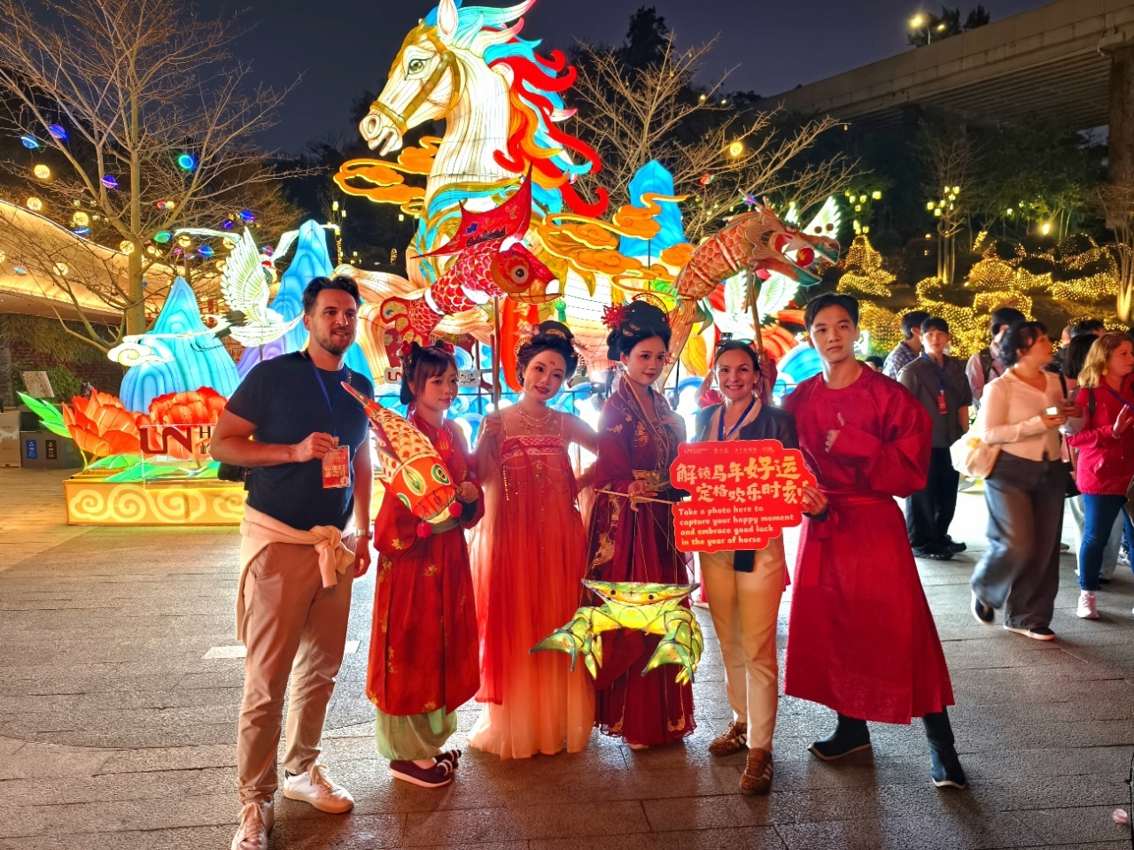 夜间开放的“限定版”云萝植物园里,园林艺术与马年春节主题的灯光装置融合,“国潮神驹”“灯廊跃锦”“幻光森林”等15组大型主题新春花灯让“广州过年,花城看花”呈现出与白天迥然不同的意蕴。“感觉千万盏灯同时在眼前,我之前从来没见过这样的景象。”来自德国的Wolfgang向记者表达惊喜。此外,古风NPC巡游、放飞祈福灯等互动项目也十分受欢迎,向海外来宾传递来自中国的节庆祝福。